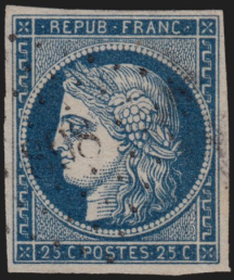 Je possède le timbre Cérès numéro 4 de 1850 – d’une valeur faciale de 25C oblitéré en point.