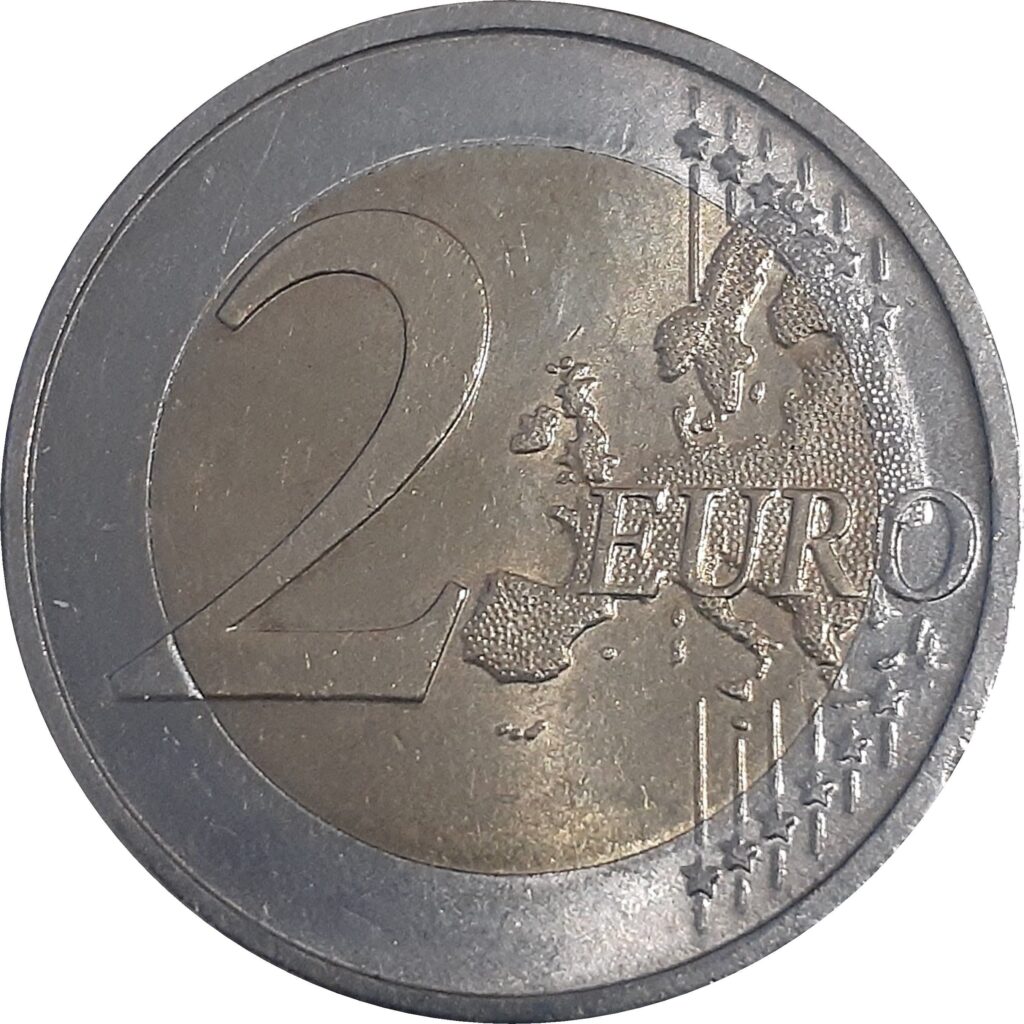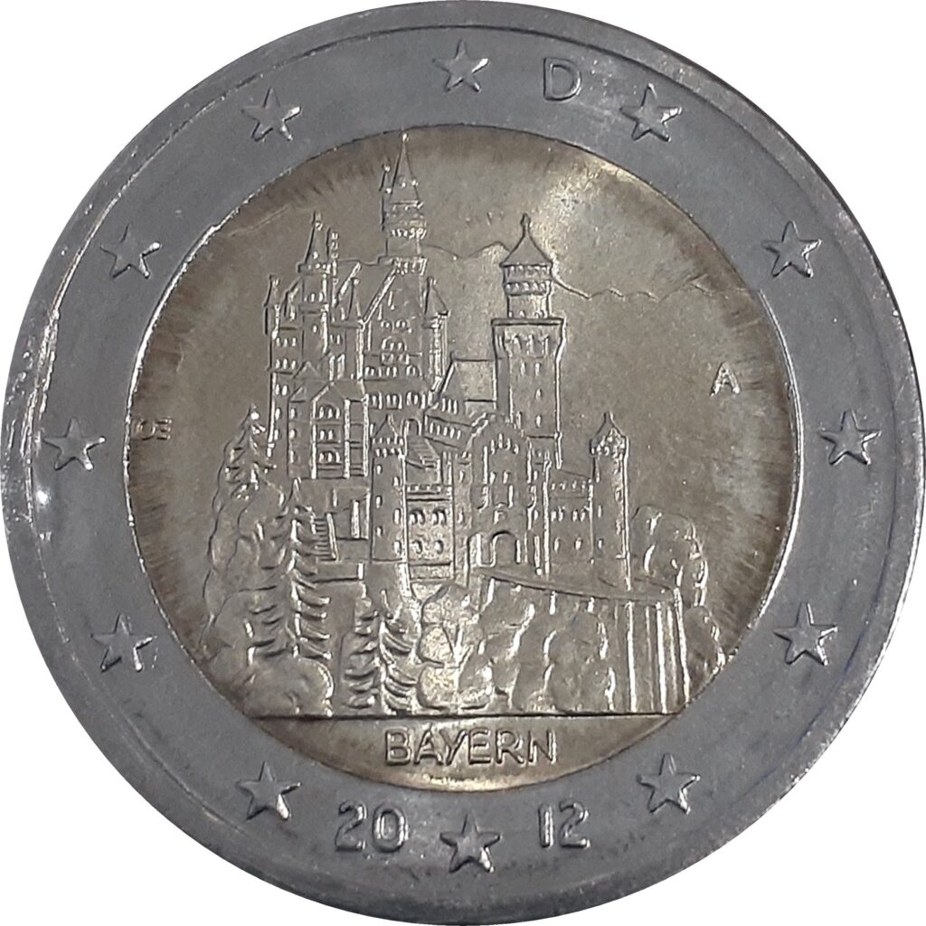 La partie interne de la pièce représente le célèbre château de Neuschwanstein construit par Louis II de Bavière. Sous le monument est inscrit le nom du land « BAYERN » et sur le côté les initiales « OE » du graveur Enrich Ott. La marque d’atelier est inscrite par une des lettres A, D, F, G ou J sur le côté droit du château. Sur le revers, une carte du continent européen est représentée sur une toile dynamique composée des douze étoiles de l’Union européenne.