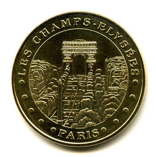 Minimédaille de la ville de Paris représentant Les Champs Elysées avec l’Arc de triomphe à l’arrière-plan et l’Obélisque au premier plan, 2019, Monnaie de Paris. Revers Millésimé : Logo de la Monnaie de Paris