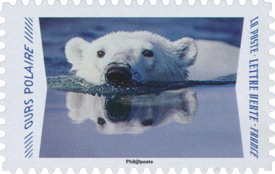En 2020, La Poste a choisi de mettre à l’honneur cet animal emblématique avec un timbre de service courant intitulé “Ours polaire”, destiné à l’affranchissement des lettres vertes jusqu’à 20 g.